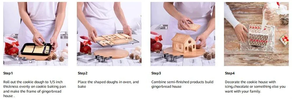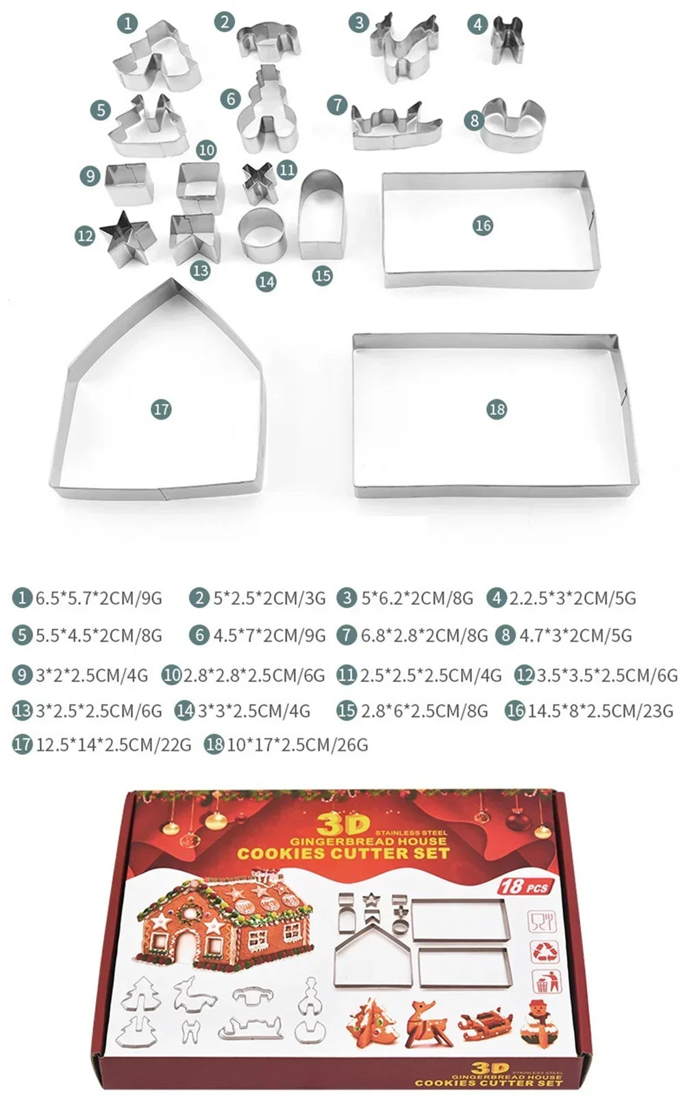 Nombre: Juego de cortadores de galletas para casa de jengibre, 18 Uds., acero inoxidable, 3D, accesorios para hornear