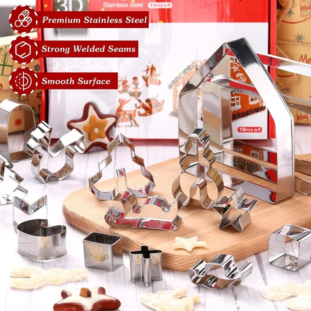 Juego de cortadores de galletas para casa de jengibre, 18 Uds., acero inoxidable, 3D, accesorios para hornear