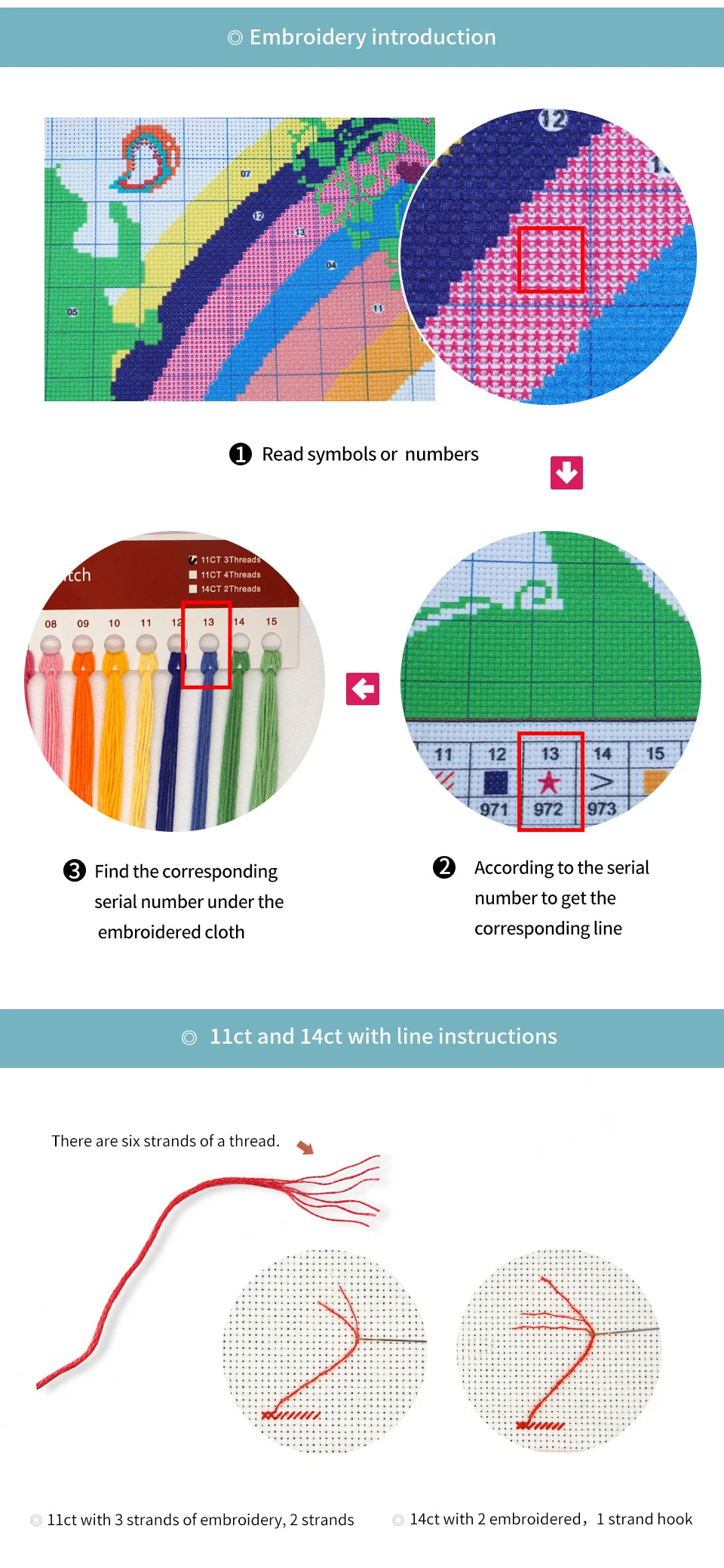 1.Un hilo de bordar incluye seis hilos.Utilice 2 hebras para la puntada entera de 14CT y 3 hebras para la puntada entera de 11CTporque la cuadrícula de lienzo de 11CT es más grande que 14CT.Significa que debes dividir un hilo en seis hilos durante el proceso de bordado.