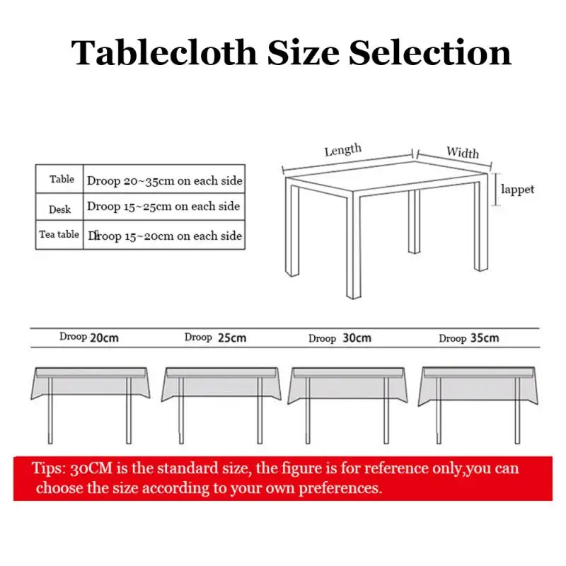 Instrucciones de lavado: Grosor medio. Puede que haya color flotante al entrar en contacto con el agua; se recomienda lavar por separado. Sugerencias de tamaño de mantel: generalmente se recomienda que el mantel tenga una caída de 30 cm y cada lado de la mesa tenga un colgante de 20 cm; la mesa generalmente tiene cuatro lados, por lo que el largo y el ancho del colgante deben agregar 60 cm; la mesa de café es la misma, el largo y el ancho deben agregarse 40 cm.